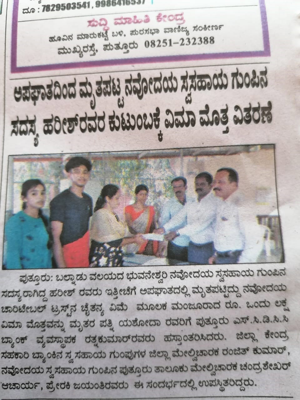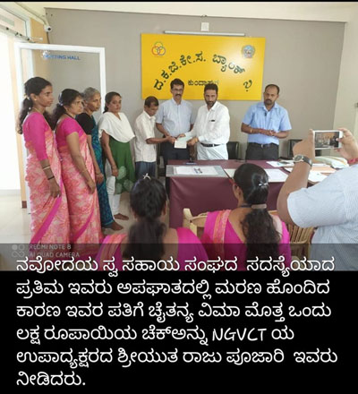 ಬಂಟ್ವಾಳ ತಾಲೂಕಿನ ನವೋದಯ ಗುಂಪಿನ ಸದಸ್ಯರಿಗೆ ಚ್ಯೆತನ್ಯ ಕ್ಲೈಮ್ ಚೆಕ್ ನೀಡುವುದು. |